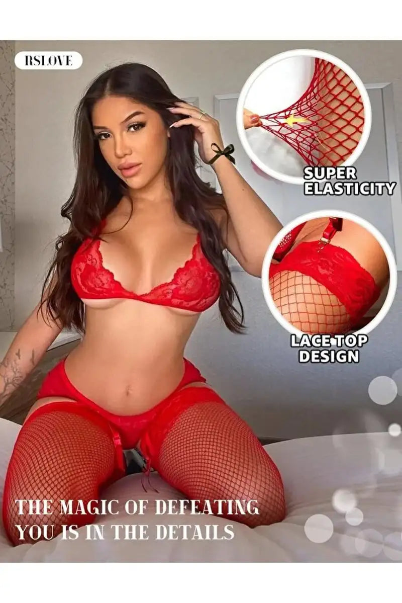 Kadın Kırmızı File Silikonlu Jartiyer Çorabı