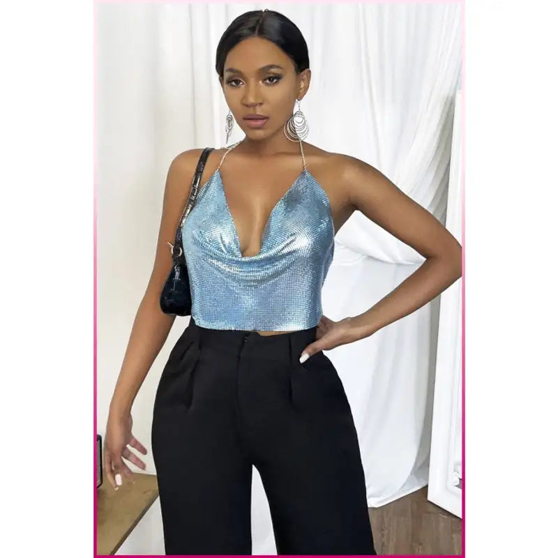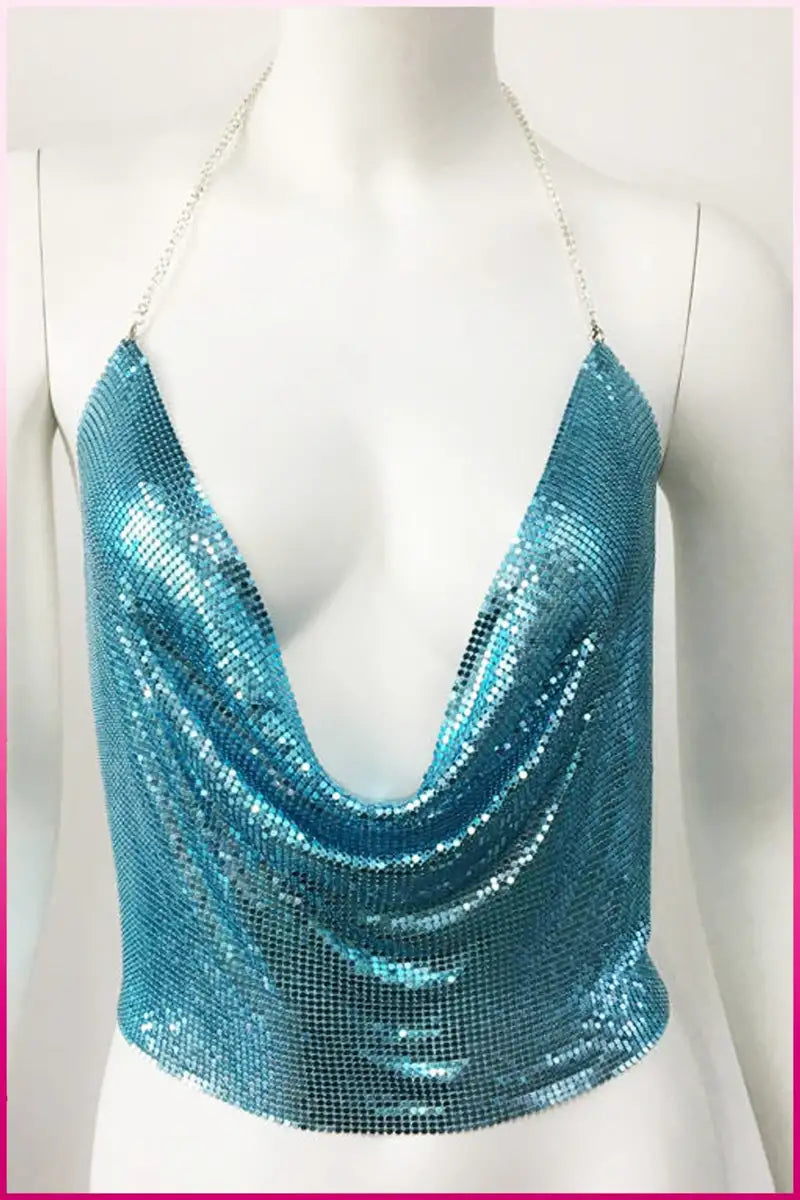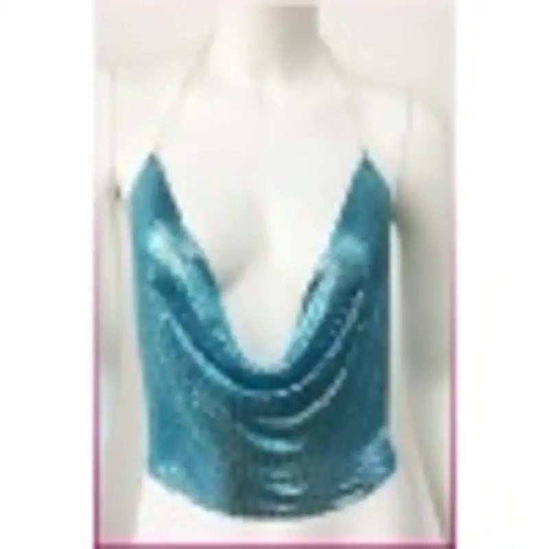 Kristal Mavi Taşlı Parlak Crop & Bluz Kolsuz Kayık Yaka Parti Plaj Büstiyer