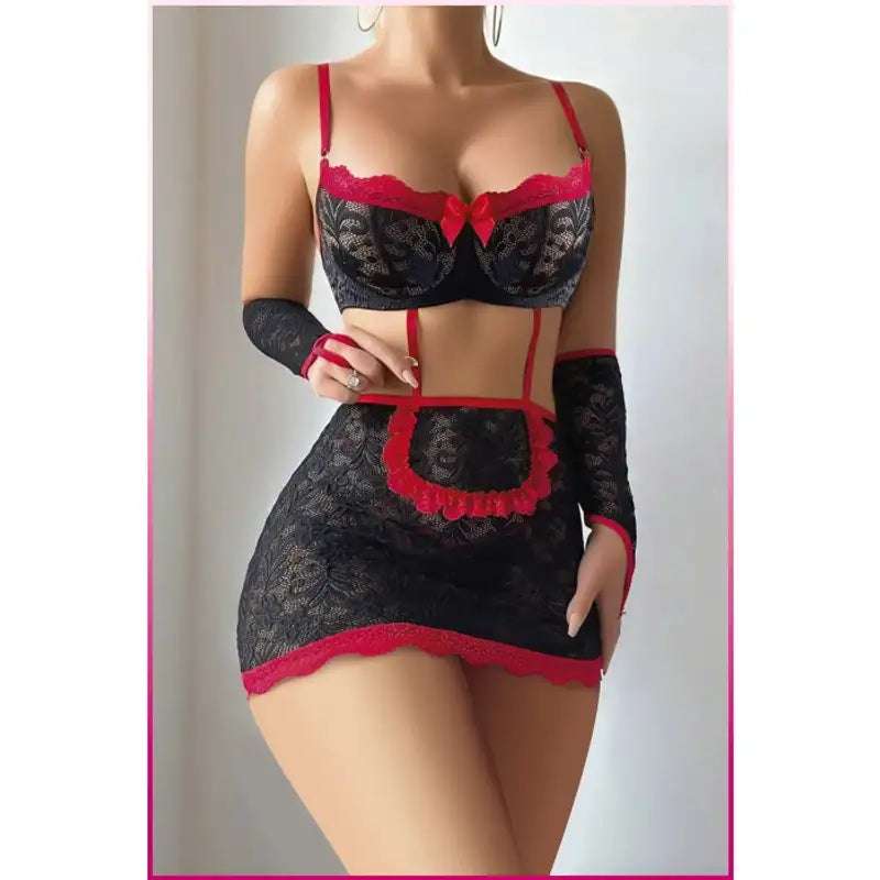 Kadın Siyah Dantel Etekli, Kol Bantlı, Göğüs Balenli Fantazi Kostüm